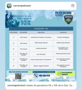 Al tiempo que, agradece el apoyo brindado por los sectores de la región Enriquillo.Barahona – La Policía Nacional dio a conocer los nombres de los ganadores por categoría de la carrera 10K y 5K, celebrada el pasado 12 de octubre en la ciudad de Barahona, evento que se destacó como el más importante en la región Enriquillo en el ámbito deportivo. La competencia, que contó con la participación de cientos de corredores locales y nacionales, fue un rotundo éxito gracias al gran respaldo brindado por los diversos sectores de la comunidad.