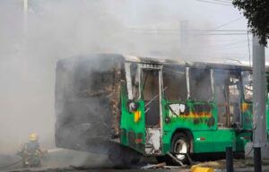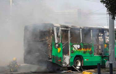 Bomberos apagan un autobús incendiado en Guadalajara en medio de la violencia desatada tras la captura y muerte del líder del Cártel de Jalisco, Nemesio Oseguera. (EFE)
