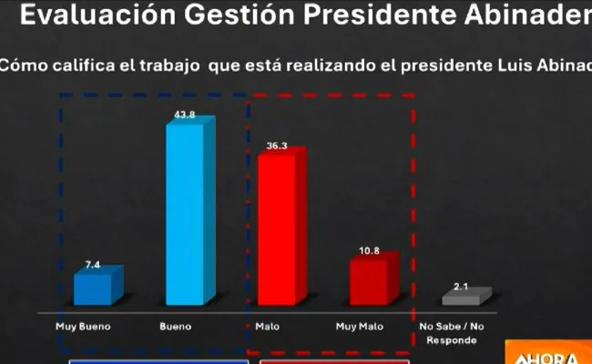 La encuesta revela que la evaluación positiva total de Abinader es del 52.1%, frente a un 46.7% de evaluación negativa.
