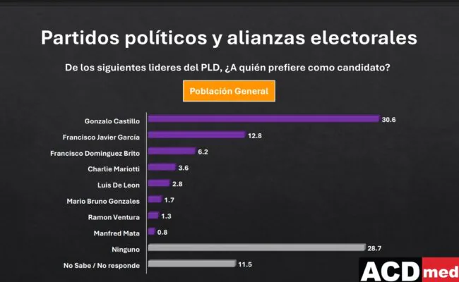 SANTO DOMINGO.- El ingeniero Gonzalo Castillo es preferido como candidato presidencial del opositor Partido de la Liberación Dominicana (PLD) para las elecciones presidenciales del 2028, establece una encuesta de ACDMEDIA publicada este lunes.